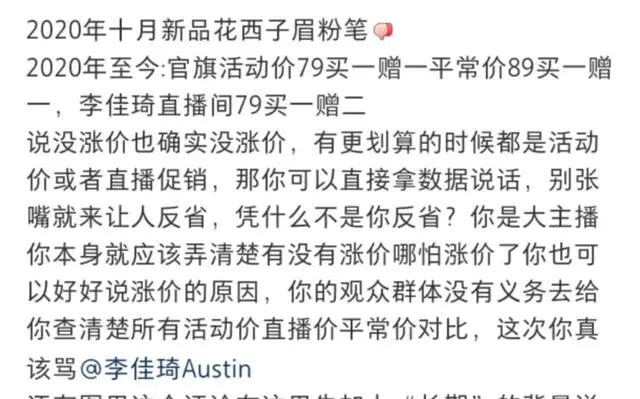 “带货一哥”李佳琦再一次翻车了,因为售卖近80元的眉笔被吐槽贵,结果他本人直接开怼消费者,言论引发了争议。9月10日下午,李佳琦因带货怼网友一事登上微博热搜,引发广泛热议。在李佳琦带货一款花西子眉笔时,直播间有网友质疑“花西子的眉笔越来越贵了”。当即,李佳琦力挺花西子,“不要乱说,眉笔一直79元,国货很难的。有时候找找自己原因,这么多年工资涨没涨,有没有认真工作。”李佳琦此言论一出,引发网友热议。不少网友愤慨道“这个价格还不贵啊?”“你可以解释为什么这么贵,但不能攻击消费者吧,这多少上升到人身攻击了。”但也有网友表示“一句话至于让大家这么激动吗?”据悉,该款花西子眉笔在李佳琦直播间的价格为79.9元,买一支送两支替换装。值得注意的是,有网友将各美妆品牌眉笔每克的价格做了一个整合。可以发现,花西子的眉笔每克价格要高于大部分美妆品牌。评论区有网友调侃道,“一只眉笔1g相当于1.5g黄金,花西子比黄金还贵。”