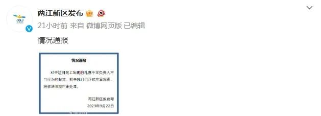 重庆“两江新区发布”微博9月24日发布情况通报: