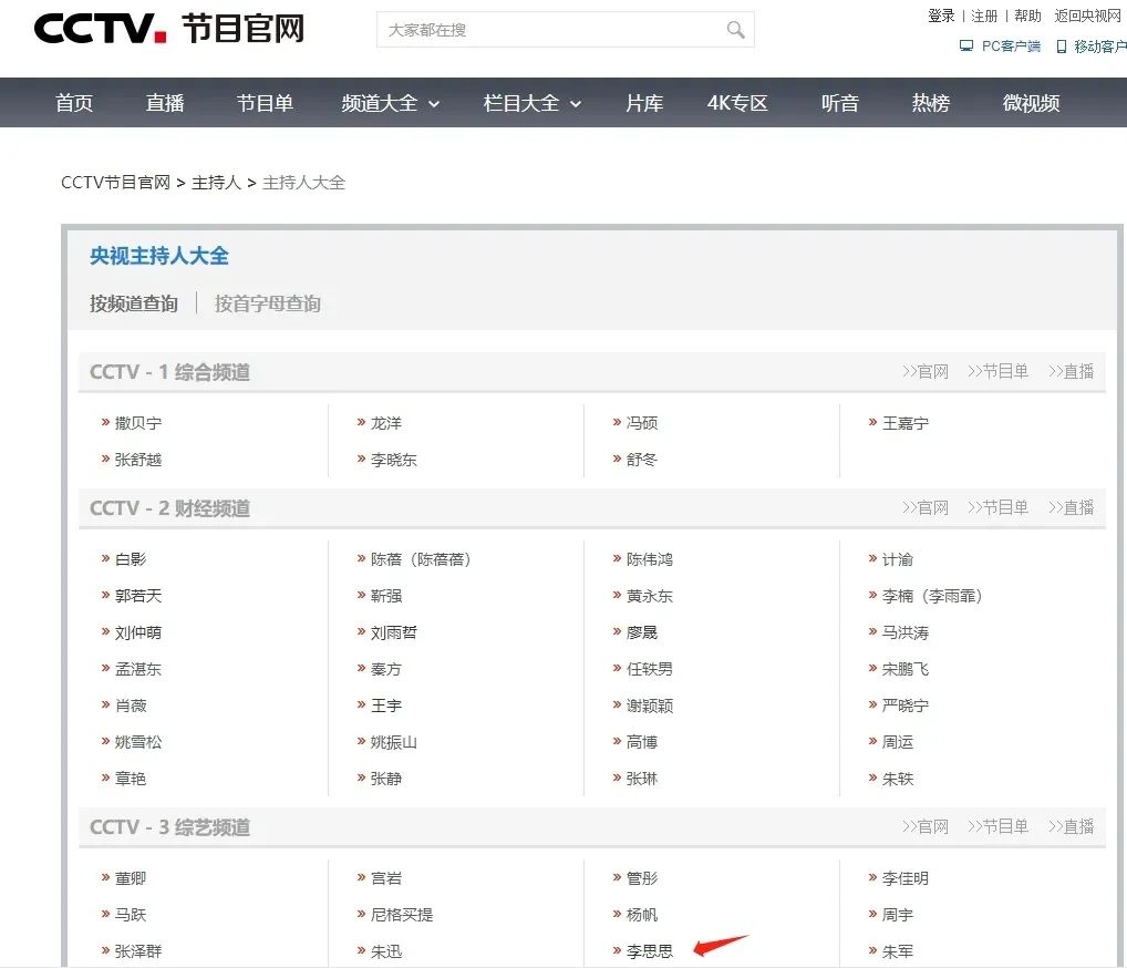 目前,CCTV节目官网主持人名单中,CCTV-3综艺频道主持人仍有李思思的名字。