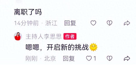 随后有网友在评论区问“离职了吗?”李思思对其回复道:“嗯嗯,开启新的挑战。”