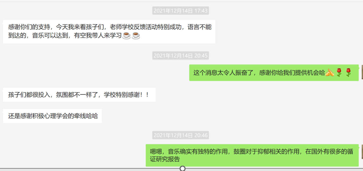 2021年,上海某中学出现冲动的学生众目睽睽之下,伤害同学和老师的恶性事件,部分同学因为目睹现场,产生严重的创伤后应激障碍。上海精总的专家以及区教研院的青少年心理专家起初使用传统的心理干预手段,感觉效果不太明显,于是邀请凡音的音乐心理专家共同参与,凡音的专家给出事年级做了两场整体鼓圈,一个星期之后,出事班级的同学状态均有明显好转,区教研院的专家还特别转达了校长的感谢。