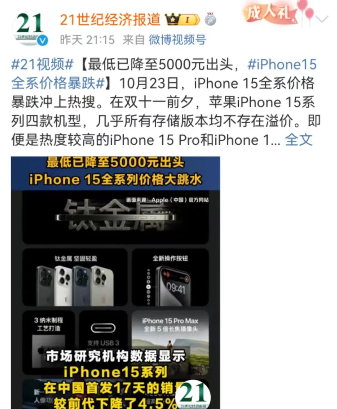 最近,#iPhone 15全系价格暴跌#冲上热搜第一,这让提前入手苹果新机的“果粉们”顿感不香了。