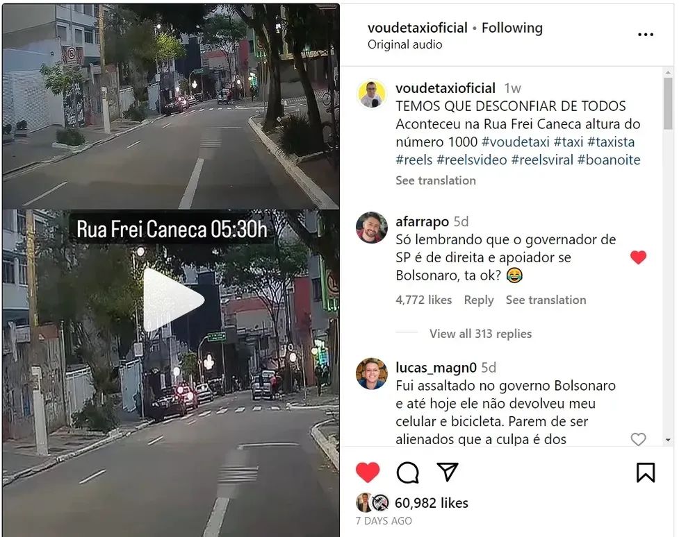 上周,一名来自圣保罗的出租车司机在圣保罗市中心地区的弗雷卡内卡街 (Rua Frei Caneca),一个小时内拍摄到了三起手机抢劫案件。视频在巴西社交媒体上疯传,图片在 Instagram 上的浏览量已超过 370 万次。