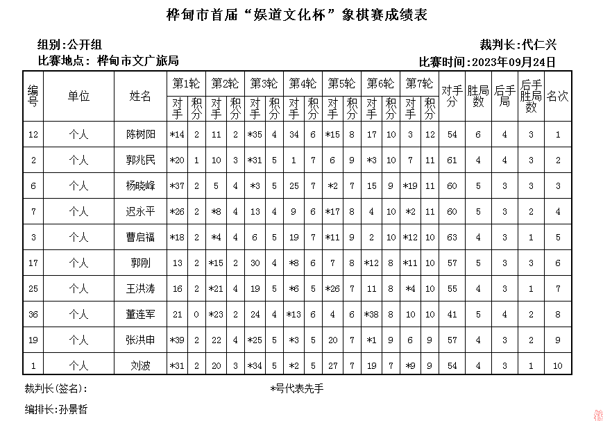 由于受疫情影响,已经连续三年没有大型赛事。此次由李志先生赞助的“娱道文化杯”象棋公开赛激发了参赛选手的热情。拼杀激烈,精彩纷呈。直到最后一轮开始前仍然看不到冠军花落谁家。冠军得主陈树阳第二轮即失手,但从第三轮开始豪取五连胜,收获了棋坛生涯的第二冠。亚军得主郭兆民一路磕磕绊绊四次死里逃生。最后一轮与迟永平鹬蚌相争,使冠军旁落。季军得主杨晓峰曾称霸桦甸棋坛二十余年。此次赛事六轮战罢已无缘冠军。此外没有取得名次的老棋手孙俊林、韩光玉、于贵元、刘连才、李克增等都有精彩对局奉献。期待下一次的比赛有更激烈的对抗,更精彩的对局。