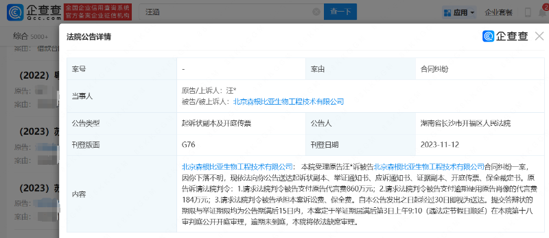 近日,湖南省长沙市开福区人民法院以公告形式向北京森根比亚生物工程技术有限公司送达汪涵诉其合同纠纷一案起诉状副本及开庭传票。