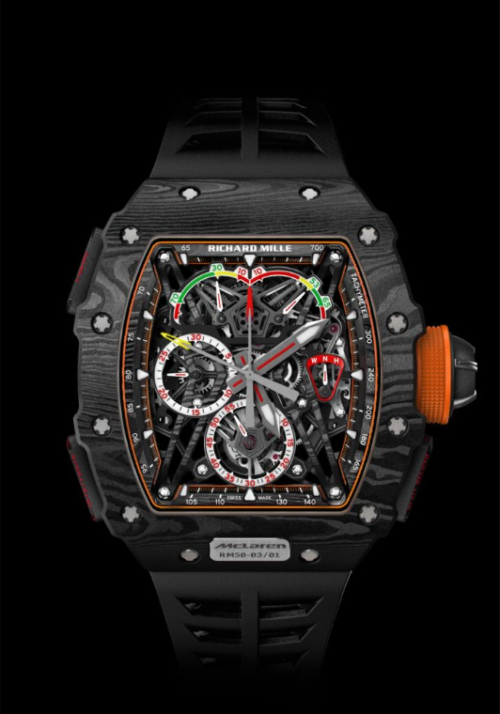 2017年,RICHARD MILLE又推出了一款更加卓越的Carbon TPT®碳纤维——Graph TPT®石墨烯,首次被应用于RM 50-03 迈凯伦F1超轻双秒追针陀飞轮计时码表中。石墨烯是一种二维纳米材料,具有正六边形稳定结构,理论上只有一个原子层厚度,是已发现最轻、最薄、强度最大、导电性和导热性最好的材料。2004年,科学家在曼彻斯特大学实验室里首次成功分离石墨烯,2010年被授予诺贝尔奖。石墨烯的引入明显提高了碳的物理特性,它是一种革命性的纳米材料,重量比钢轻六倍,强度则高出200倍。