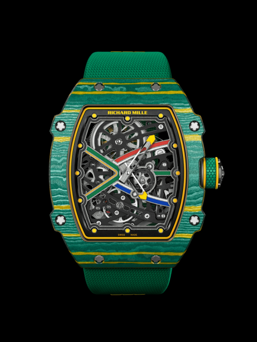 碳纤维是黑色的,难以着色,应用在腕表中略显单调。品牌创始人Richard Mille先生为研发团队布置了新任务:寻找新的有色复合材质。通过与North Thin Ply Technology (NTPT TM)的合作,又开发了Quartz TPT®石英纤维,将其与Carbon TPT®碳纤维混合后能焕发出无数炫丽色彩。Quartz TPT® 石英纤维与 Carbon TPT® 碳纤维具有相似的强度、耐磨和轻量属性,RM 67-02 是彩色 Quartz TPT® 石英纤维腕表代表作:黄色和绿色灵感源自南非的国旗色, 红色则是卡塔尔国旗色之一。