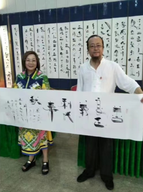 与世界妈祖文化协会关金花会长合影并赠字,善良正义利他奉献。