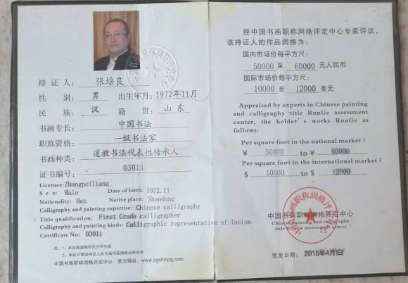 人物小传:张培良,男,全真道华山派二十代弟子,字:芦栌;号:独醉居主人;法号:信凌;道号:常阳子云体飘逸道风来。1972年生于大连,现任国际奇绝艺术家协会常务副主席、国家一级书画师、世界奇绝书画艺术博览会执行秘书长、大连市社会科学界联合会委员、大连市华夏文化促进会理事、《华夏风采》编委、大连市青年书法协会会长等职务。