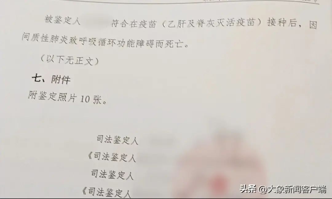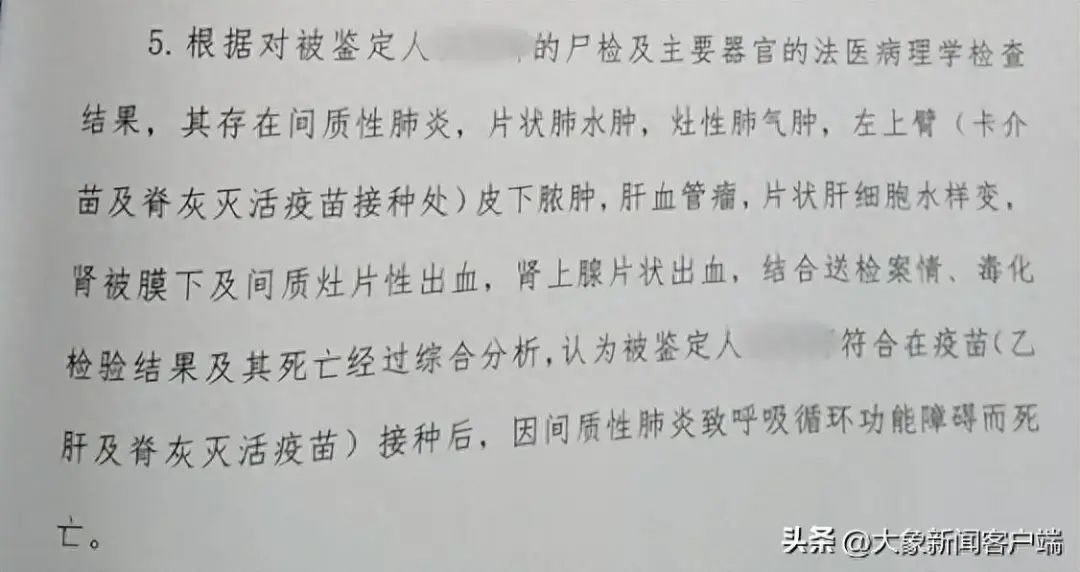 11月20日,记者从男婴父亲处了解到,目前尸检报告已出。报告显示:“被鉴定人伍某某(男婴)符合在疫苗(乙肝及脊灰灭活疫苗)接种后,因间质性肺炎致呼吸循环功能障碍而死亡。”