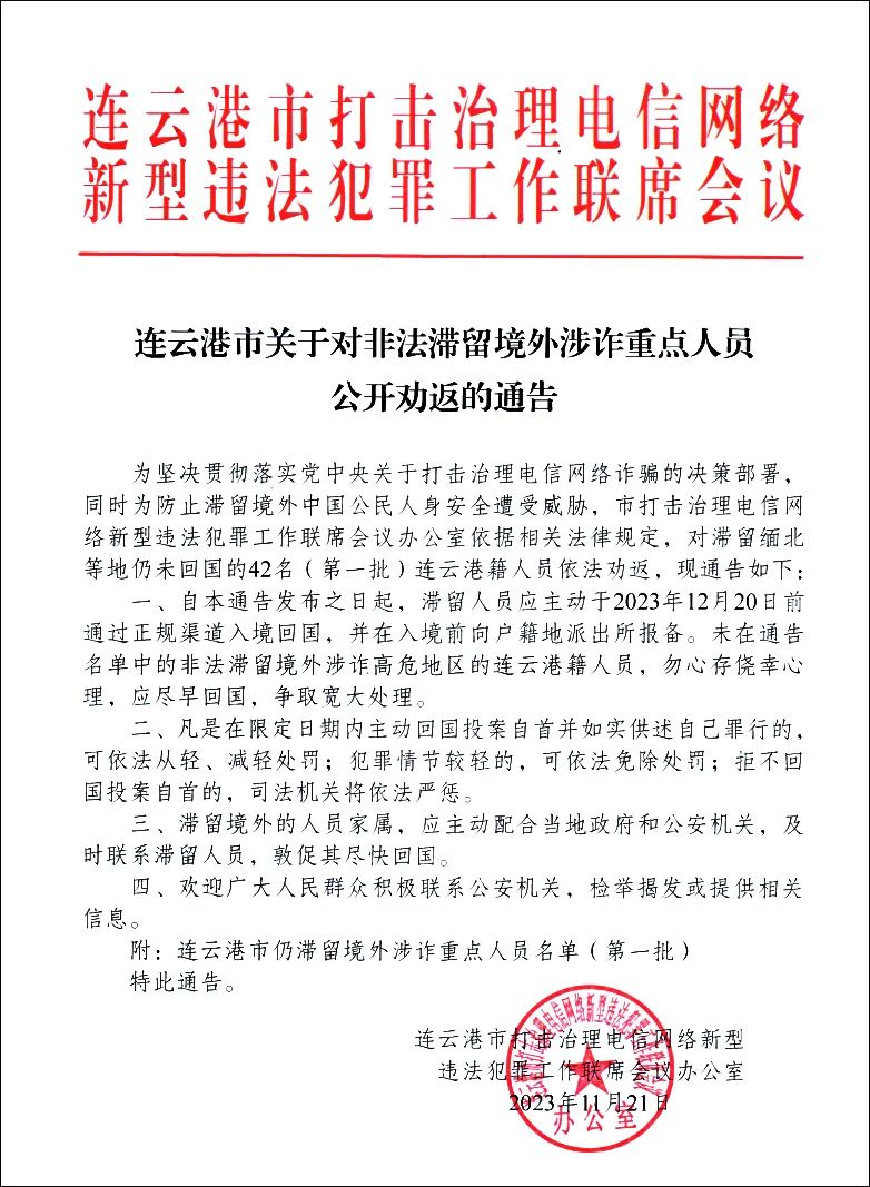 微信公众号“连云港警方”11月25日发布关于对非法滞留境外涉诈重点人员公开劝返的通告,公布首批42人劝返名单。