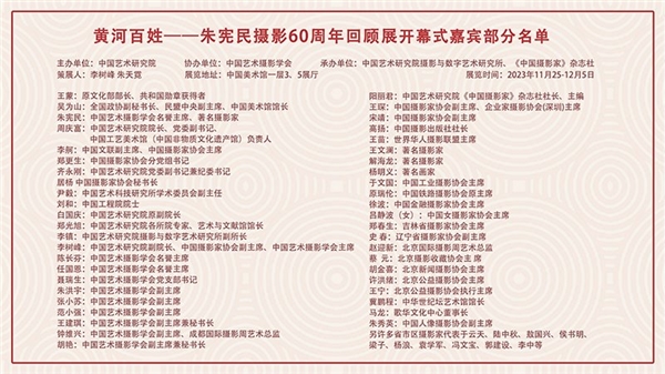 出席摄影展开幕式和学术研讨会的还有原文化部部长、共和国勋章获得者、中国艺术研究院原院长王蒙,中国艺术研究院院长、党委副书记、中国工艺美术馆(中国非物质文化遗产馆)负责人周庆富,全国政协副秘书长、民盟中央专职副主席、中国美术馆馆长吴为山,中国文联副主席、中国摄影家协会主席李舸,中国摄影家协会分党组书记、副主席郑更生,中国摄影家协会党组成员、秘书长居杨,中国艺术摄影学会主席团李树峰等成员,中国摄影家协会各部门负责人,及中国艺术研究院各部门专家。此次展览将持续至2023年12月5日。