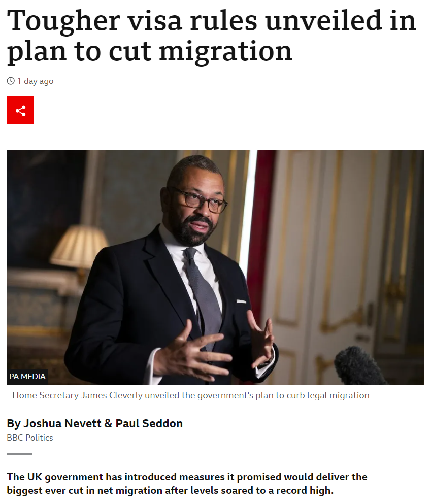 在净移民水平飙升至历史新高的情况下,近日,英国内政大臣詹姆斯·克莱弗利宣布了一项遏制移民的新措施。