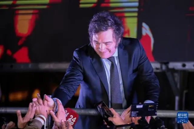11月19日,米莱在首都布宜诺斯艾利斯的竞选总部外向民众致意。图源:新华社
