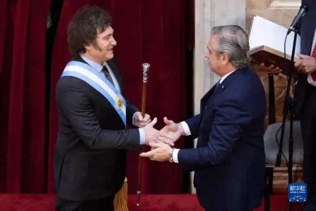 当天,米莱在阿根廷国会向宪法宣誓,并从前任总统费尔南德斯手中接过绶带和权杖。