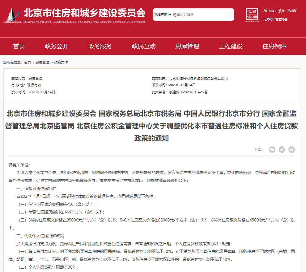 北京市住房和城乡建设委员会 国家税务总局北京市税务局 中国人民银行北京市分行 国家金融监督管理总局北京监管局 北京住房公积金管理中心关于调整优化本市普通住房标准和个人住房贷款政策的通知