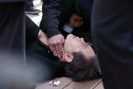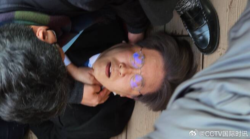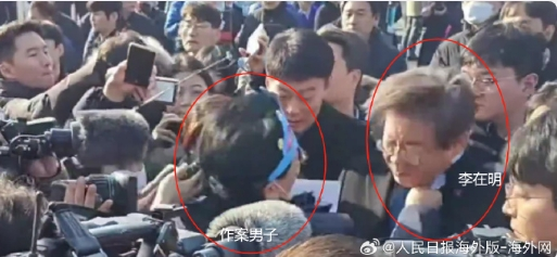 据报道,“行凶者为一名五六十岁的男子,头戴写有李在明支持者团体相关字样的纸王冠,靠近李在明‘求签名’时突然拿出一把约20厘米至30厘米长的刀刺向李在明的颈部,李在明颈部出血”。该名男子已在现场被控制。