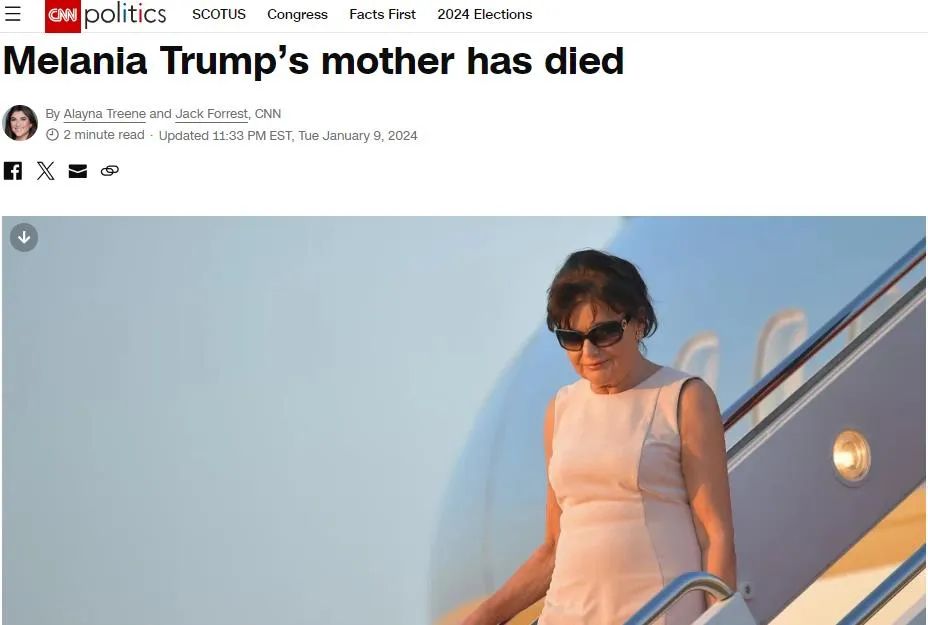 据美国媒体报道,当地时间9日晚,前美国第一夫人梅拉尼娅·特朗普在社交媒体上发文称,其母阿玛利加·纳夫斯(Amalija Knavs)逝世,终年78岁。