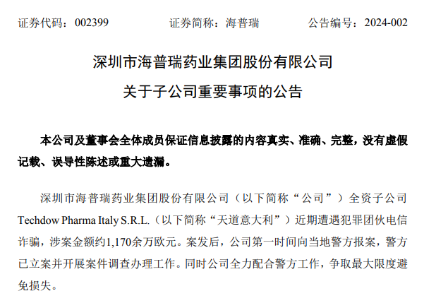 案发后,公司第一时间向当地警方报案,警方已立案并开展案件调查办理工作。同时公司全力配合警方工作,争取最大限度避免损失。海普瑞表示,公司管理层已在第一时间向所有董事、独立董事及审计委员会通报,初步判断本次为偶发事件,并确认公司生产经营正常运转。管理层谨慎审视这一突发事件,积极采取措施加强内部控制管理,提高规范治理水平,提升风险防范意识。公司管理层严肃对待此事,已派人前往子公司处理该事项。由于案件正积极侦办中,结果尚无法确认,或对2023年度财务报表造成潜在影响。