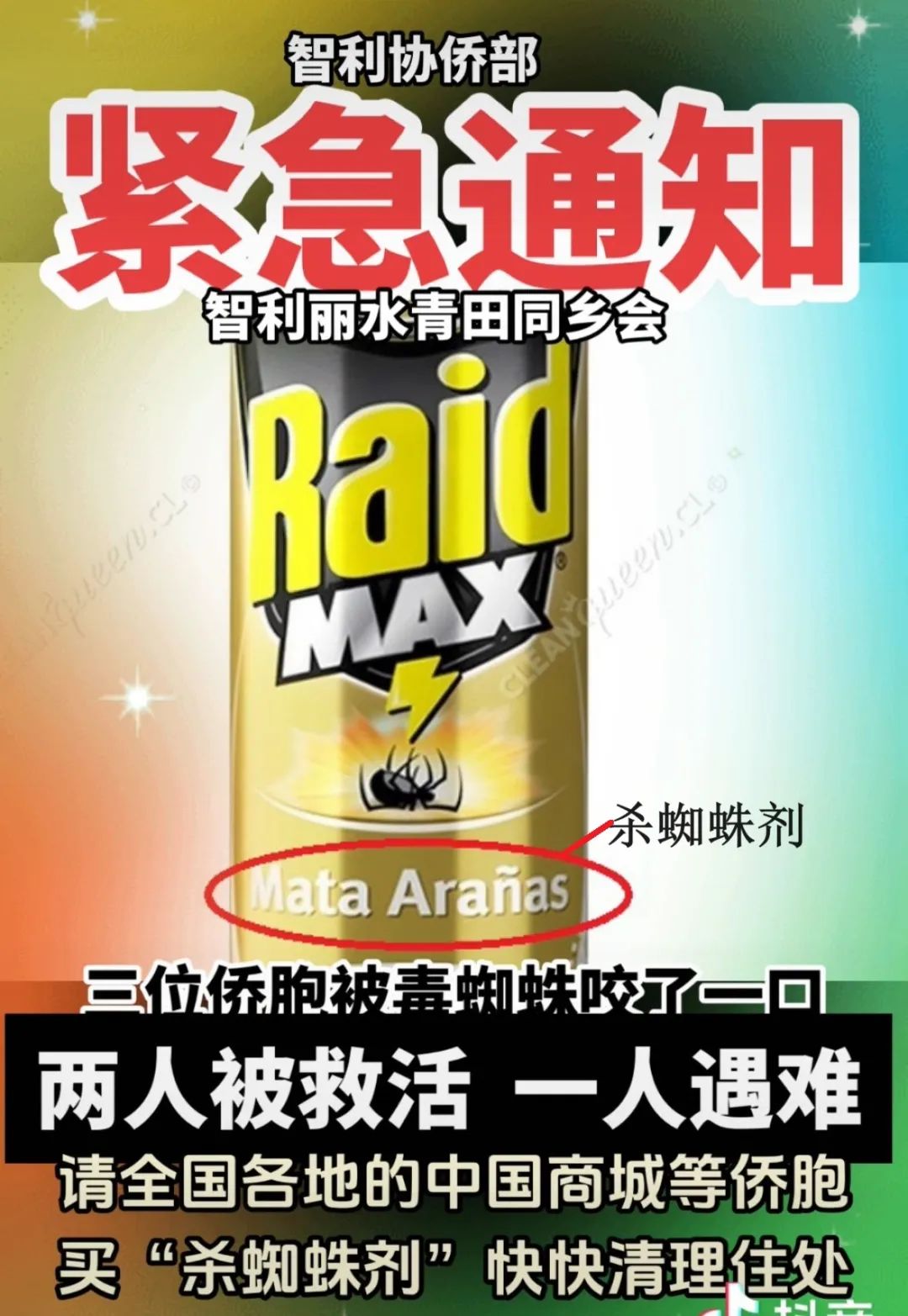 近日,智利南部多个城市连续发生三起侨胞被蜘蛛咬伤的事件。其中两人得到了有效的救治,已经脱离危险,然而,一名在OSORNO市“中国商城”的侨胞在被毒蜘蛛咬伤后不幸身亡。