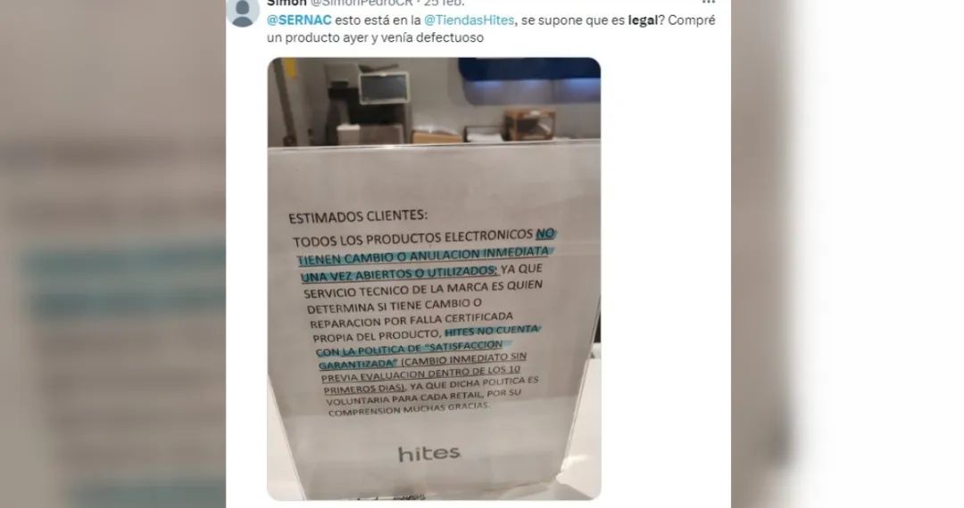 近日,智利零售巨头Hites在一分店内显眼位置张贴出一份售前声明,明文规定电子产品一经开封或使用,将不接受换货或退货。然而,此举立即引来了国家消费者协会(Sernac)的强烈反对,明确指出这一声明无效,违反了《消费者法》的规定,并还给Hites开了罚单。