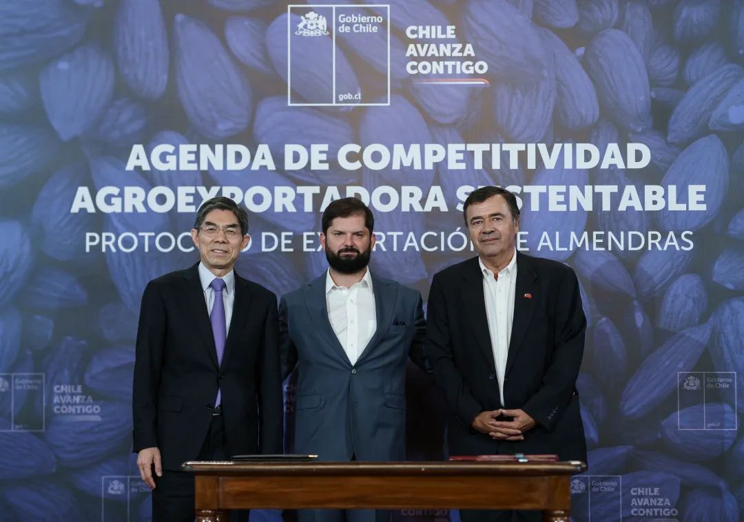 智利总统加布里埃尔·博里奇3月15日周五与中国签署了一项海关议定书。智利政府强调,该议定书将允许向中国出口无壳杏仁,从而实现双方之间的贸易多样化。这是《2023-2025年可持续农业出口竞争力议程》的一部分,是一项公私合作的工作。智利是全球第一个批准所有新鲜水果进入中国市场的国家(鲜食葡萄、苹果、梨、李子、油桃、樱桃、蓝莓、猕猴桃、托盘、柠檬、橙子、桃子等)。在2022-2023赛季,智利向中国出口了574046吨新鲜水果。主要出口樱桃(364000吨)。