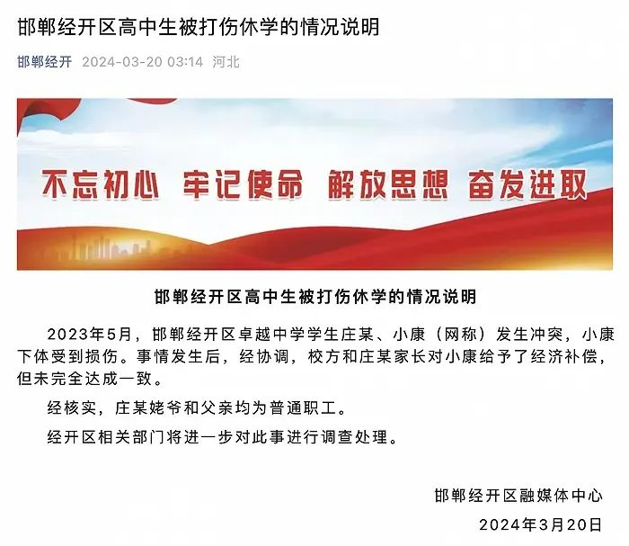 3月19日,网传邯郸一高中生被同学打伤睾丸,打人者自称姥爷是县长,事件引发关注。3月20日凌晨,邯郸经开区官方订阅号发布“邯郸经开区高中生被打伤休学的情况说明”,全文如下: