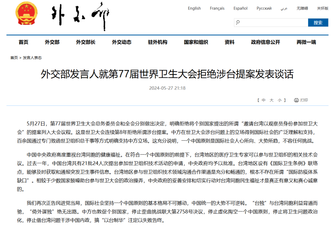 我们再次正告民进党当局,国际社会坚持一个中国原则的基本格局不可撼动,中国统一的大势不可逆转。“台独”与台湾同胞利益背道而驰,“倚外谋独”绝无出路。中方也敦促个别国家,停止歪曲挑战联大第2758号决议,停止虚化掏空一个中国原则,停止将卫生问题政治化,停止借台湾问题干涉中国内政,搞“以台制华”注定以失败告终。