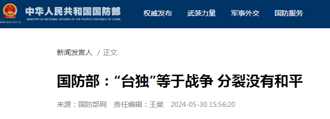 5月30日下午,国防部举行例行记者会,国防部新闻局局长、国防部新闻发言人吴谦大校答记者问。记者:据报道,台湾地区领导人赖清德5月20日发表所谓“就职”演讲,鼓吹两岸“互不隶属”,妄称大陆军事行动是“和平稳定的最大战略挑战”,叫嚣“对和平不能有幻想”,鼓噪“强化国防力量”。请问对此有何评论?吴谦:赖清德“5·20”讲话充斥着对台湾同胞的欺骗、对大陆人民的恶意、对“洋人主子”的谄媚和对“以武谋独”的妄想,是一篇“倚外谋独”“以武谋独”的自白书。解放军对此坚决反对,并以行动强力回击。台湾自古以来就是中国领土,历史经纬清晰、法理事实清楚。《开罗宣言》和《波茨坦公告》明确规定把日本窃取的中国领土台湾归还中国,联合国大会第2758号决议明确了世界上只有一个中国,台湾是中国的一部分。不久前联合国秘书长发言人明确表示,台湾就是中国的一个省。民进党当局置这一基本事实于不顾,顽固坚持“台独”立场,煽动两岸对立对抗,充当外部势力的“遏华棋子”,构成对国际秩序的严重挑战、对地区和平的严重破坏。“台独”分裂活动是台海和平的最大现实威胁。世界潮流,浩浩荡荡,顺之则昌,逆之则亡。祖国统一是不可阻挡的历史大势。“台独”等于战争,分裂没有和平。中国人民解放军肩负着维护国家主权和领土完整的神圣使命,始终枕戈待旦、厉兵秣马,坚决打掉一切“台独”分裂图谋,坚决挫败一切外部势力干涉。