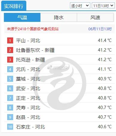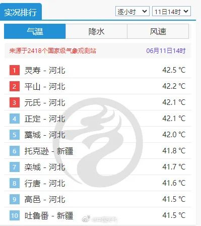 今天14时气温榜上,河北气温已“刹”不住车了,仍在向上冲,河北灵寿、平山、元氏、正定、藁城等地气温甚至已达42℃!同一时次的吐鲁番甚至成了榜单“垫底”。(由于有东西经度跨度大有时差,新疆地区还未到最热的时次,因此吐鲁番气温也还没到顶点。)