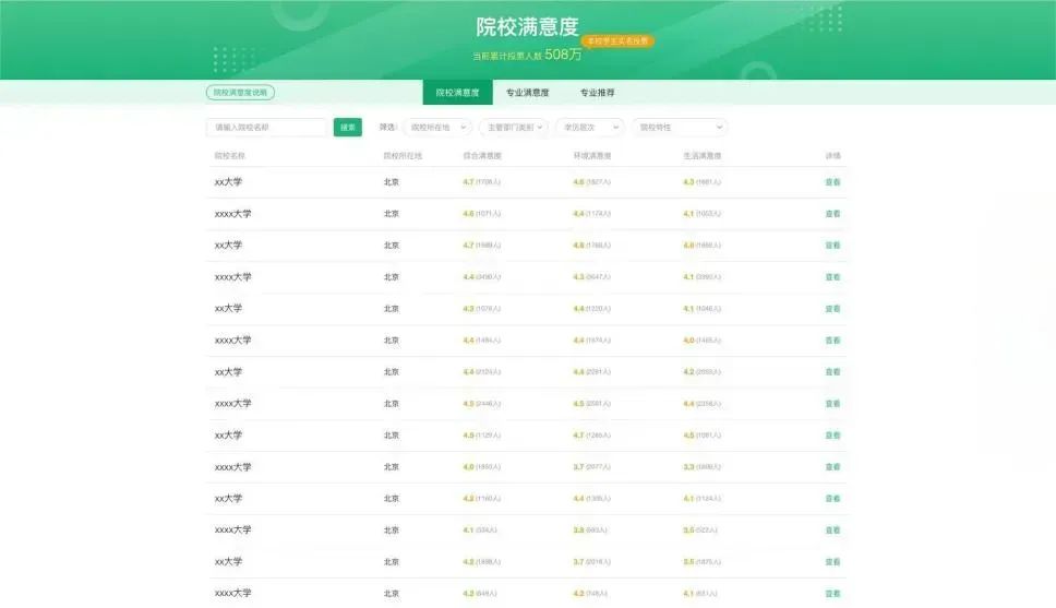 依据往年录取情况,根据考生高考成绩(位次),按照“冲稳保”的填报原则,结合心理测评结果,个性化生成志愿参考建议,展示录取情况、专业满意度、就业去向等全方位数据。
