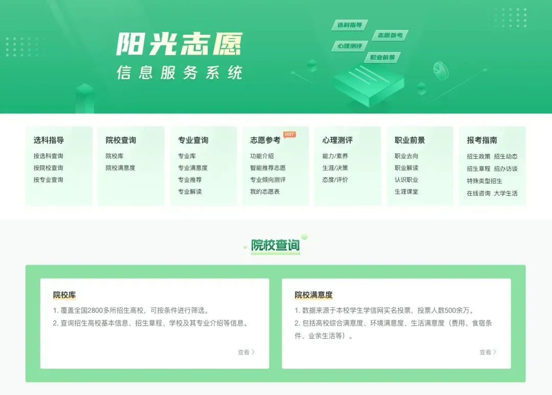 2024年,教育部“阳光高考”信息平台面向高考生免费开放“阳光志愿”信息服务系统,基于招生、就业、调查、测评等大数据,结合深度专业和职业解读,提供志愿推荐、专业介绍、心理测评、就业去向及前景查询等服务。