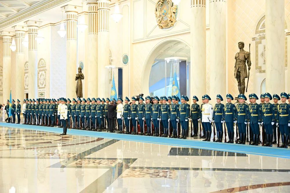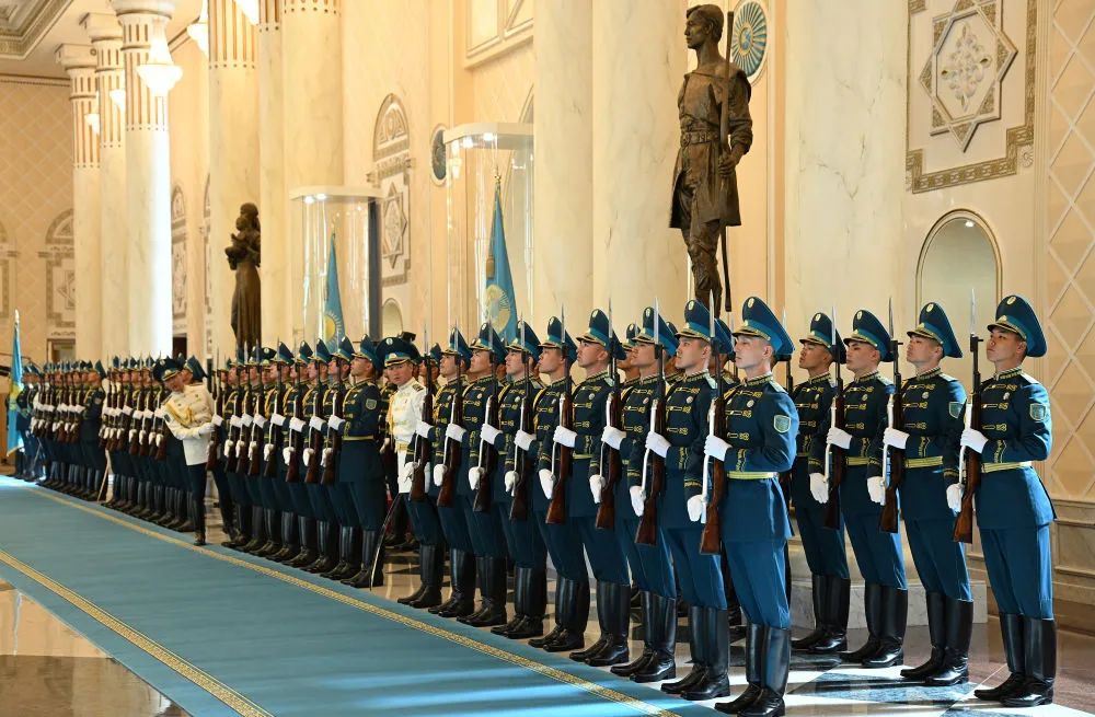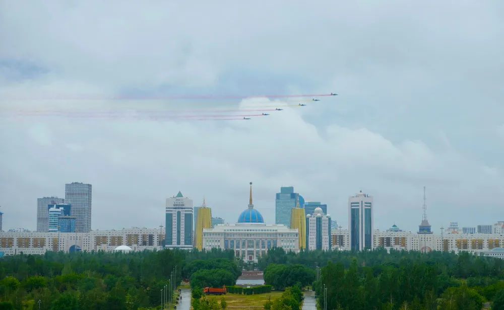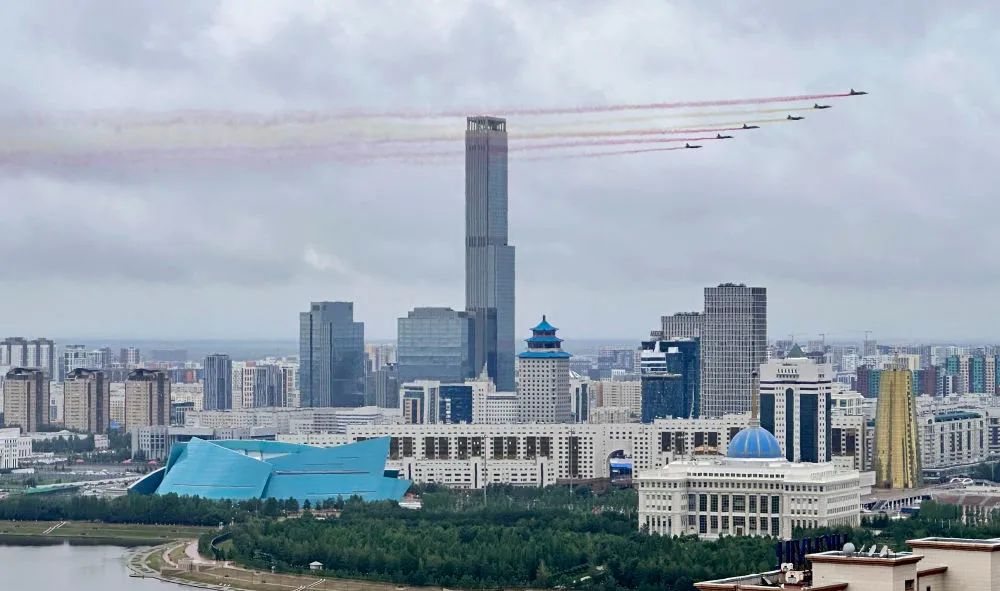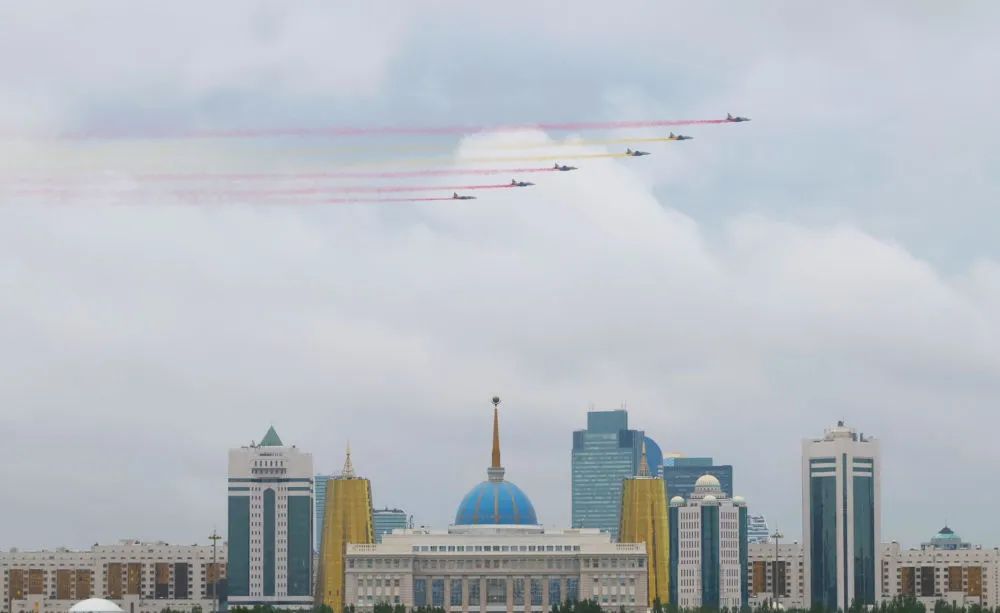 当地时间3日上午,国家主席习近平出席哈萨克斯坦总统托卡耶夫在总统府举行的欢迎仪式。抵达时,哈方多架战机在总统府上空拉出中国国旗色彩烟欢迎中国贵宾。