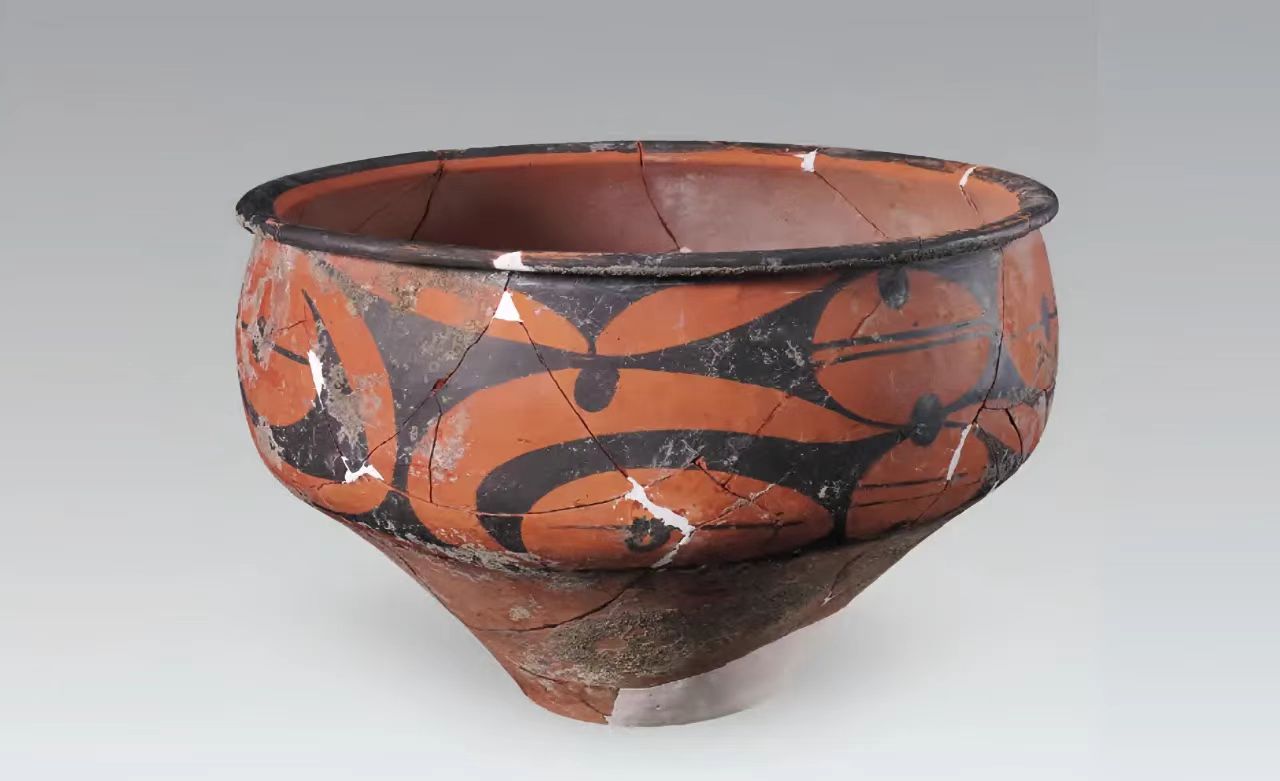 考古人员在山西离石吉家村遗址发现的彩陶盆。(山西省考古研究院 供图)