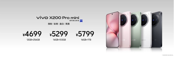 vivo X200 Pro mini则采用了高颜值直屏设计,6.31英寸小直屏拥有极窄四等边,8.15mm超薄机身仅重187g,带来舒适的握持,揣入上衣口袋即可轻松出发。vivo X200 Pro mini共发布了钛青、微粉、直白、简黑四款多彩配色。其中,钛青采撷自大自然治愈柔和的青绿色,微粉则是落樱缤纷色彩与金属质感的浪漫结合,搭配磨砂质感的AG玻璃,两款配色尽情散发着时尚多彩的青春气息。vivo X200 Pro mini同样搭载蔡司超级长焦,采用潜望设计并支持长焦微距,同时拥有vivo与索尼联合定义的主摄图像传感器蓝图x索尼LYT-818,影像实力“超级”在线。除此之外,蓝晶x天玑9400、公里级无网通信、蔡司大师色彩屏、全亮度高频PWM调光、OriginOS 5 AI新体验、5700mAh大电池等面面俱到,合力打造“一超多能”年度口袋旗舰。