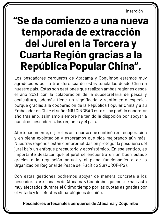 10月29日,智利北部阿塔卡玛大区和科金博大区手工渔业协会在智利第一大报《信使报》发表声明,感谢中方在区域渔业管理组织框架下向智转让鲭鱼捕捞富余配额,帮助受厄尔尼诺现象影响的智手工渔民渡过难关。
