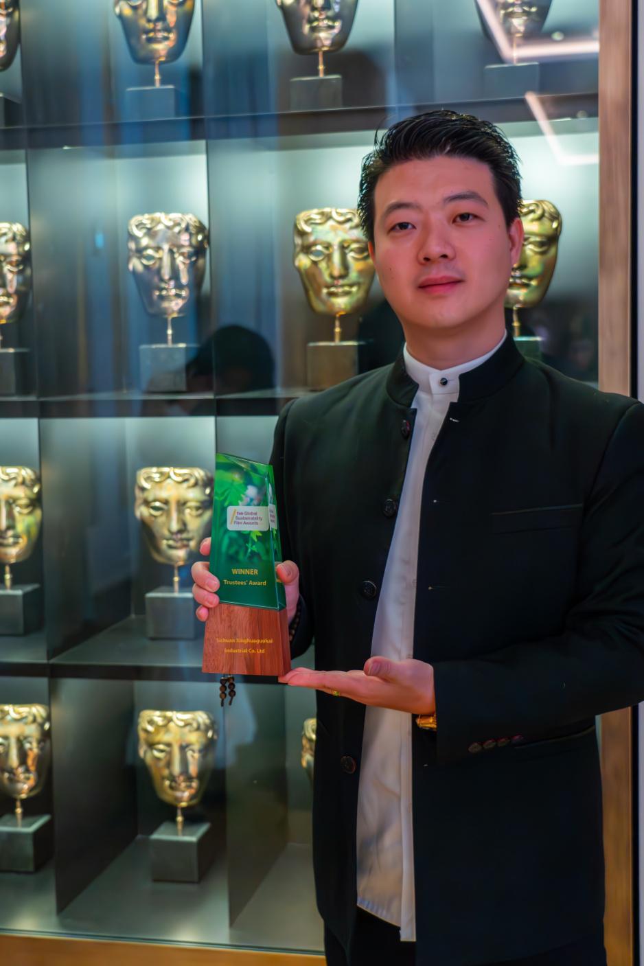 图为TVE全球可持续发展电影奖主席Mei Sin OBE(中)、亚太地区荣誉主席Helen Wang(左)向出品人兼编剧王钦甲(右)颁发本届英国TVE全球可持续发展电影奖“评审团特别奖”。