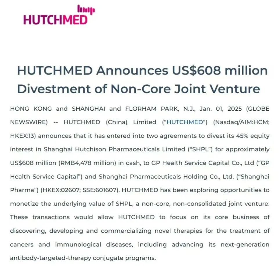 1月1日,和黄医药宣布出售其在上海和黄药业45%的股份
