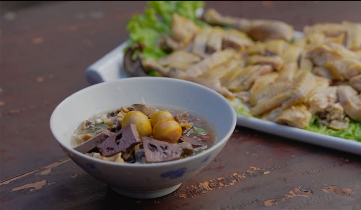 红河县是中国最大的哈尼族聚居县,民俗与风土,造就出个性鲜明的饮食样貌,餐桌上的哈尼蘸水鸡就是代表。小母鸡冷水下锅慢慢炖煮,煮熟后白切装盘,香柳、苤菜根、刺芫荽等植物香料切碎加上鸡杂调制成蘸料。这碗蘸料亦是菜肴,清新却不失厚重。哈尼蘸水鸡的形式与风味,凝聚着哈尼族的智慧。