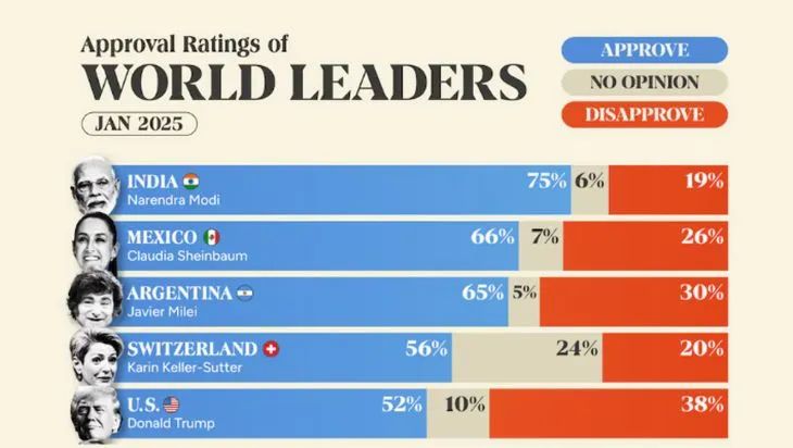 此次调查被视为衡量各个国家执政政策影响力和民众看法的关键指标。在排名中,美国总统特朗普以52%的支持率位居第五名。