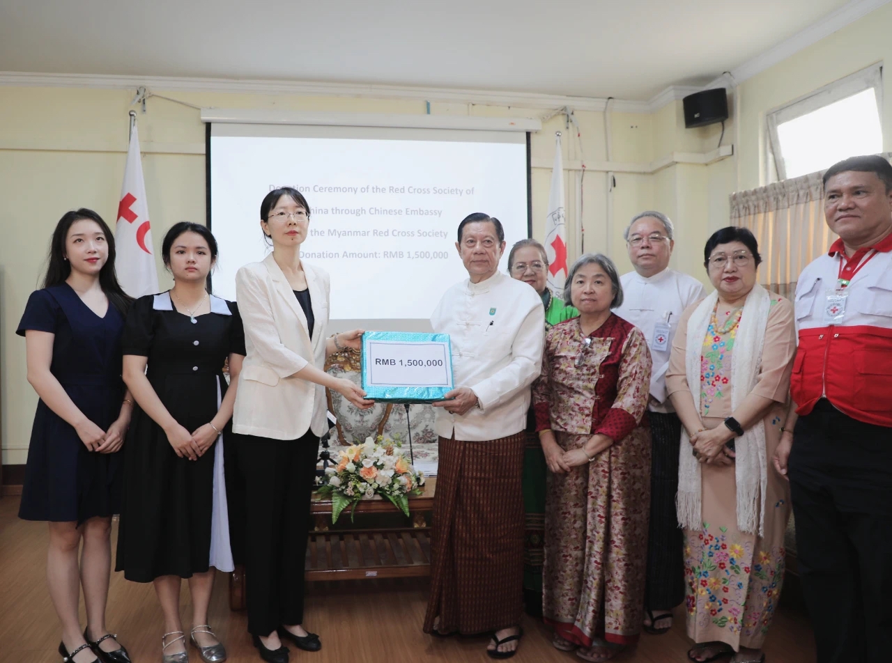中国驻缅甸大使馆公使衔参赞曹静4月1日会见缅甸红十字会主席苗纽,转交中国红十字会向缅提供的150万元人民币现汇援助。