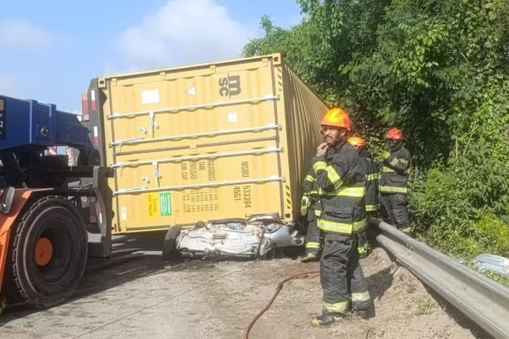 一辆载有集装箱的卡车在圣保罗海岸翻车,撞毁一辆汽车,造成三人死亡