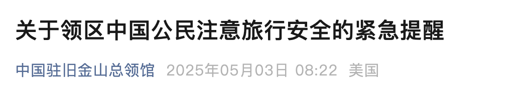 中国驻旧金山总领馆5月3日发布《关于领区中国公民注意旅行安全的紧急提醒》: