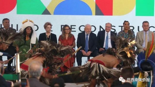 两位部长就职典礼参与者观看土著居民表演。巴西国家通讯社巴西总统卢拉(LuladaSilva)11日出席国家土著民部长索妮娅·瓜雅雅拉(SôniaGuajajara)与国家种族平等部长安妮埃里·弗兰克(