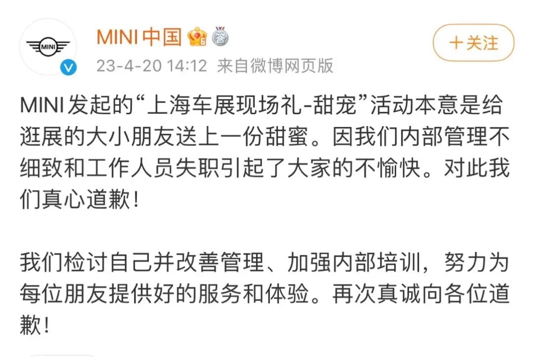 @MINI中国近日,有网友发微博爆料称,在上海车展宝马MINI展台参观时,展台工作人员拒绝给中国访客发放冰淇淋,宣称已经没了。但外国访客来领时,不仅拿到了冰淇淋,工作人员还很贴心地教他们如何食用。4月