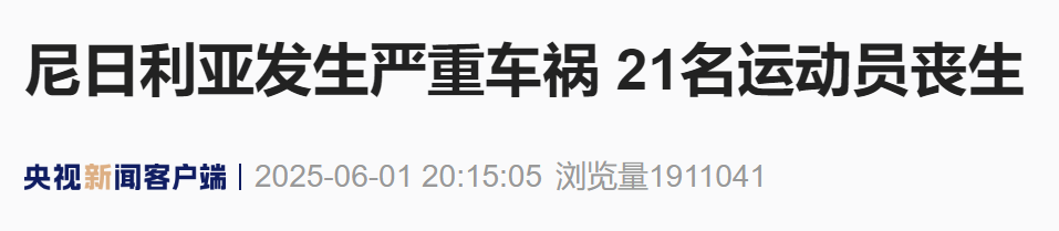 尼日利亚5月31日发生一起严重车祸,一辆大客车在高速公路上出事,车上21名运动员丧生。当地官员说,事故原因可能是司机疲劳驾驶或超速驾驶。尼日利亚联邦道路安全队说,这起事故发生在当地时间下午,没有牵涉其