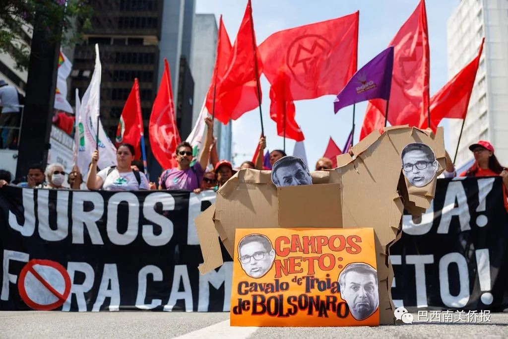 示威者用纸板做的“特洛伊木马”,上面贴有巴西央行行长坎波斯·内托和前总统博索纳罗的照片。巴西《圣保罗页报》21日上午,在巴西圣保罗市(SãoPaulo),全国统一工会(CUT)、“工会力量”(Forç