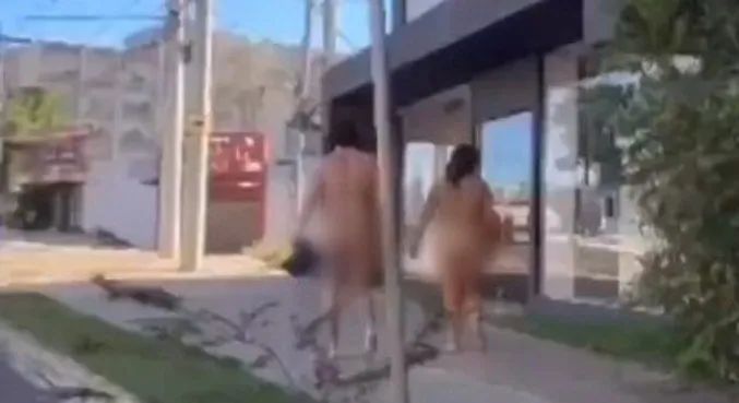巴西一对夫妇裸体在戈亚尼亚(goIânia)的SetorSul街道上行走。监控摄像头记录下了这一幕。两人走到一家美容院前,先是男子用石头砸玻璃砸门,但没有打破玻璃。接着女子用脚踢打玻璃门,但都没有成功