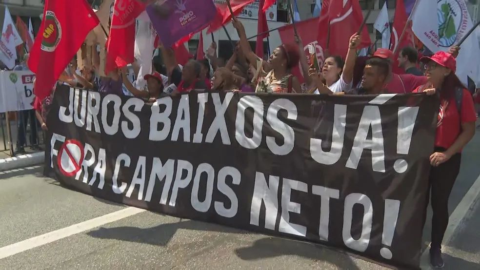 周二(21日)上午,工会和社会人士在保利斯塔大道(AvenidaPaulista)抗议巴西的高利率,人们聚集在圣保罗艺术博物馆前(Masp),两条车道被占用。抗议人群举着的横幅上写道,“减少利息,增加