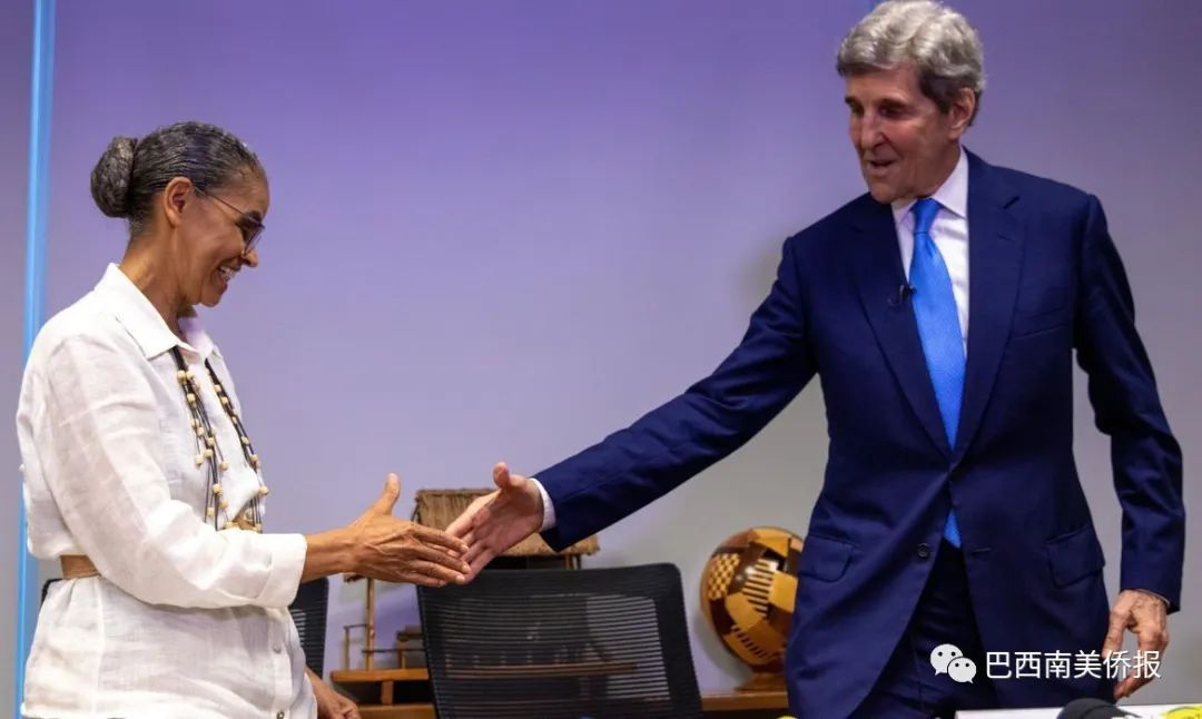 巴西环境部长玛丽娜·席尔瓦(左)与美国政府气候特使约翰·克里。巴西国家通讯社2月28日,巴西环境部长玛丽娜·席尔瓦(MarinaSilva)与美国政府气候特使约翰·克里(JohnKerry)进行了会谈
